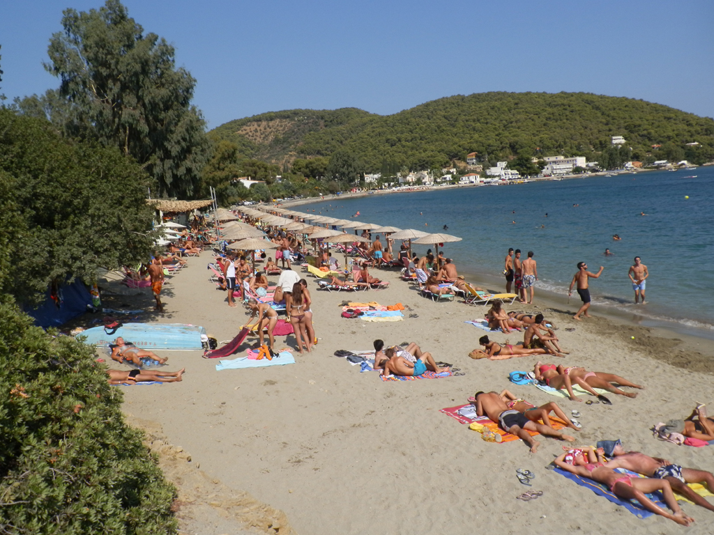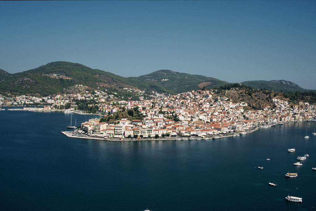 βρίσκεται απέναντι από τον Πόρο, δίπλα στην παραλία