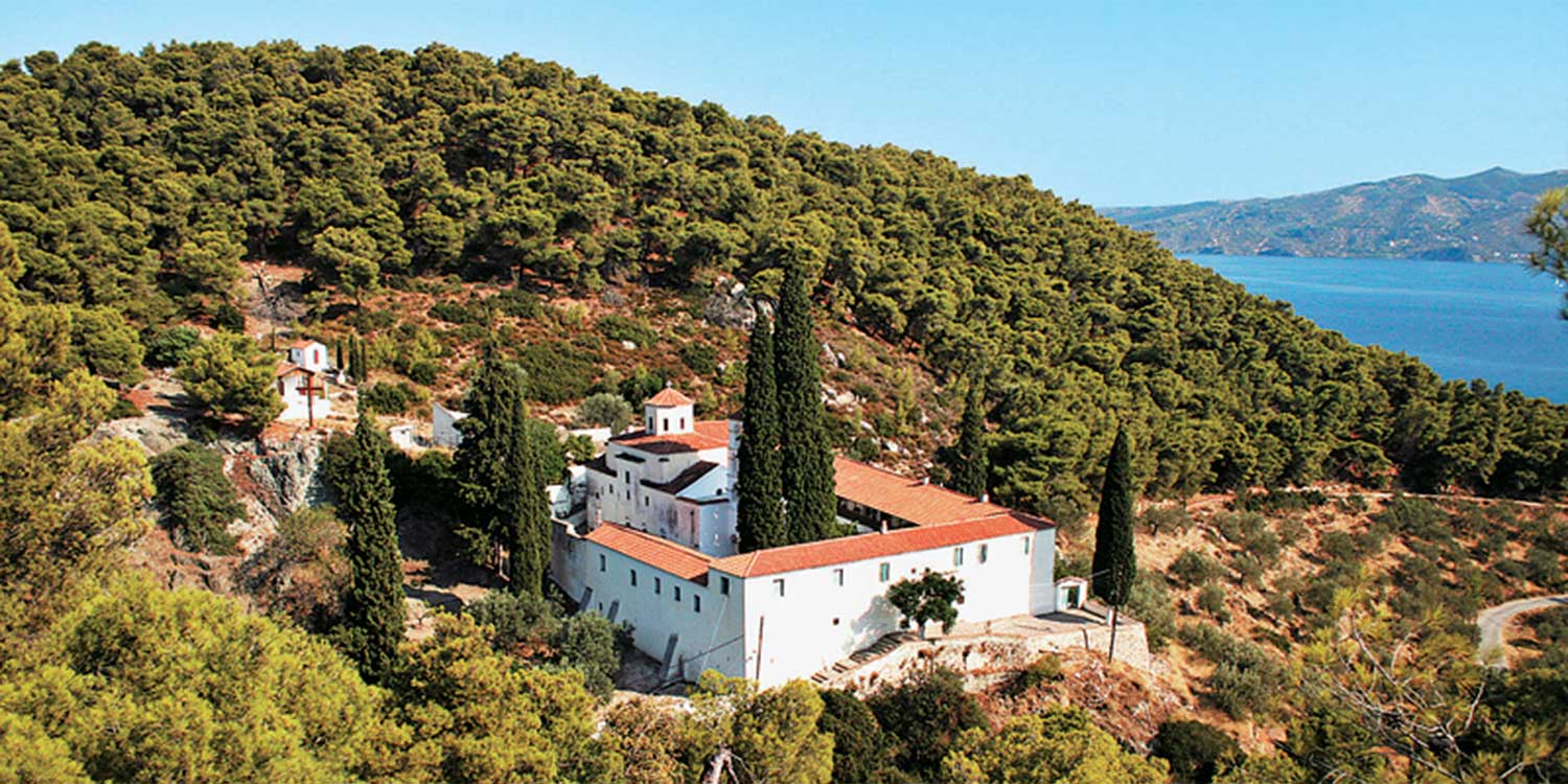 Σκαρφαλωμένη στο βουνό και πνιγμένη στο πράσινο η Ιερά Μονή Κεχαριτωμένης Θεοτόκου στην Τροιζήνα και συγκεντρώνει πλήθος προσκυνητών κάθε χρόνο.