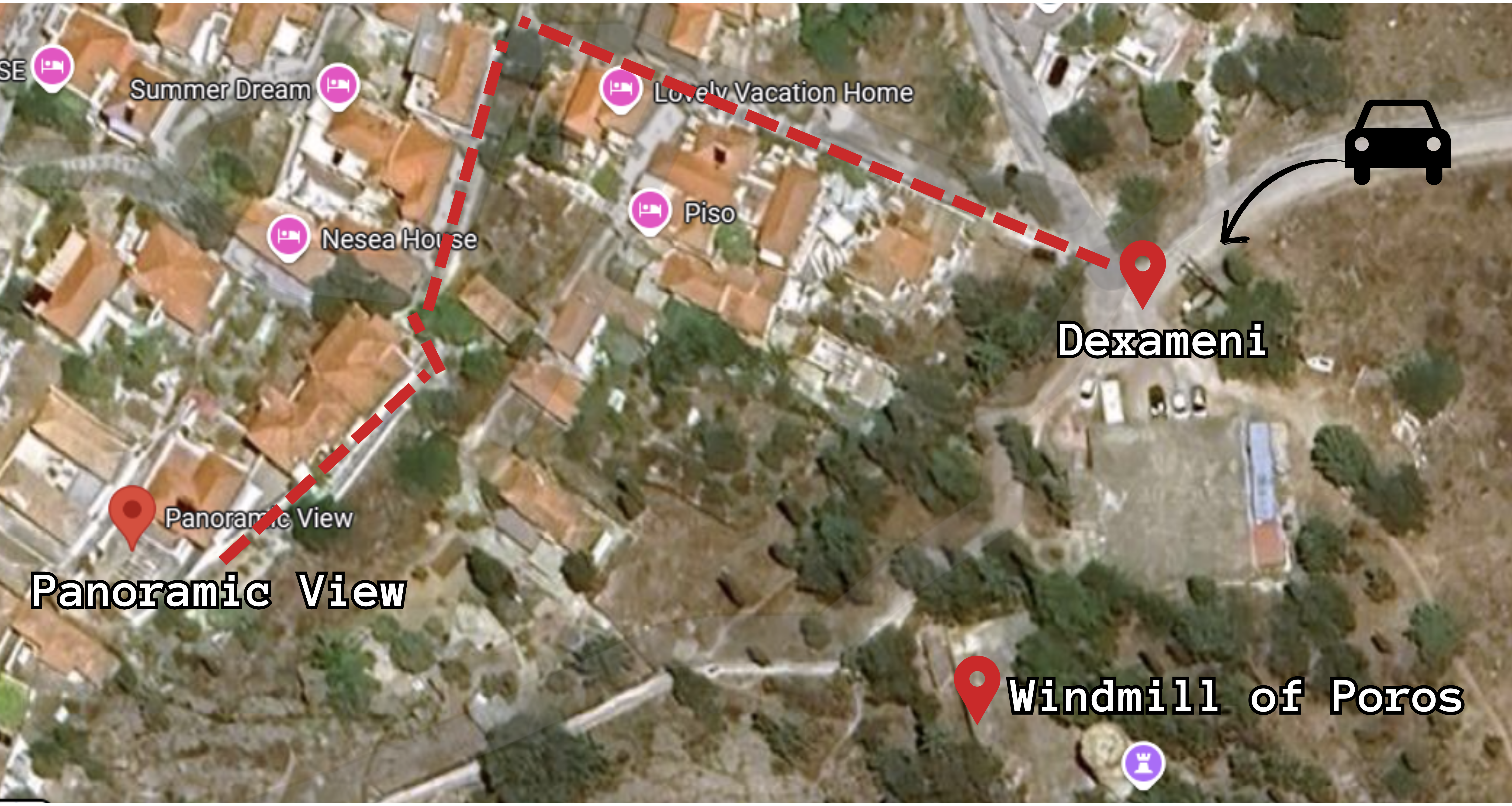 Όσοι διαθέτουν όχημα, ή με ταξί, μπορούν να φτάσουν στον Ξενώνα σε μόλις λίγα λεπτά από τον περιφερειακό δρόμο του Πόρου, ακολουθώντας την οδό Μικράς Ασίας. Ο δρόμος οδηγεί σε ένα ευρύχωρο πλάτωμα, μπροστά στη Δεξαμενή και δίπλα στον Μύλο, όπου υπάρχει δυνατότητα στάθμευσης. Από εκεί, ο Ξενώνας απέχει περίπου 3 λεπτά με τα πόδια. (Δείτε την εικόνα παρακάτω για καλύτερο προσανατολισμό.)