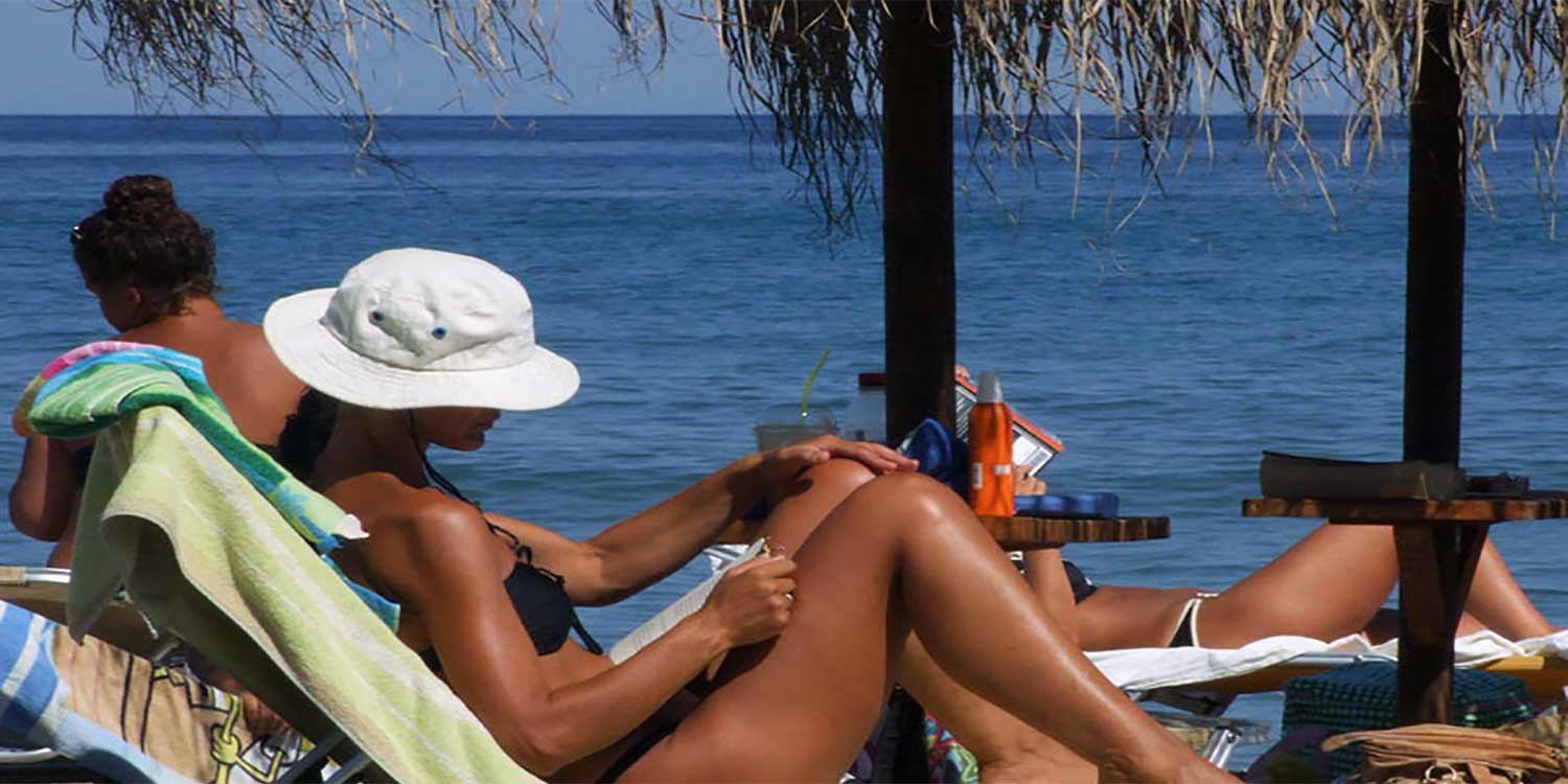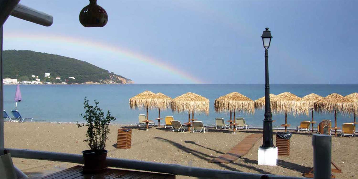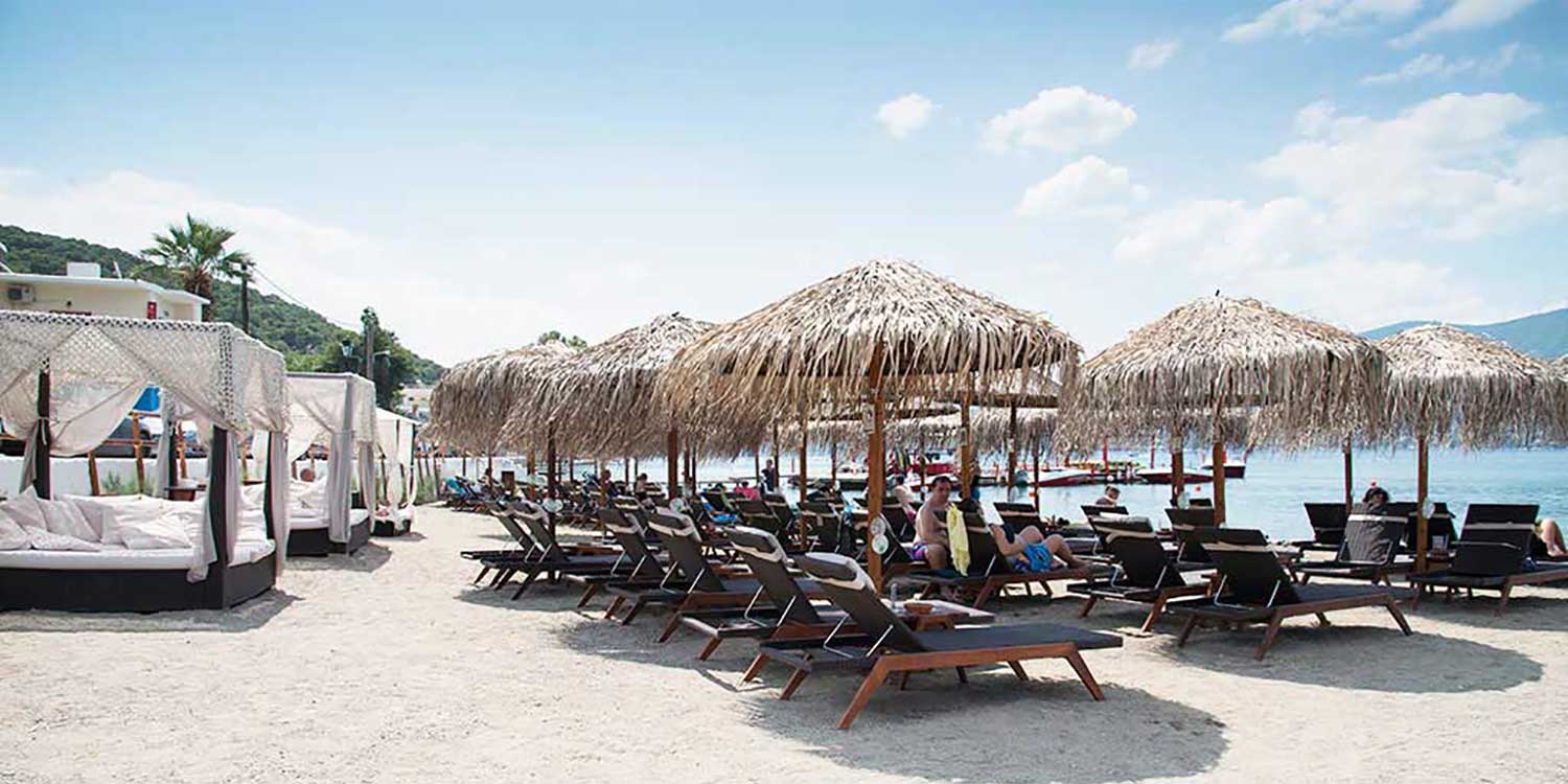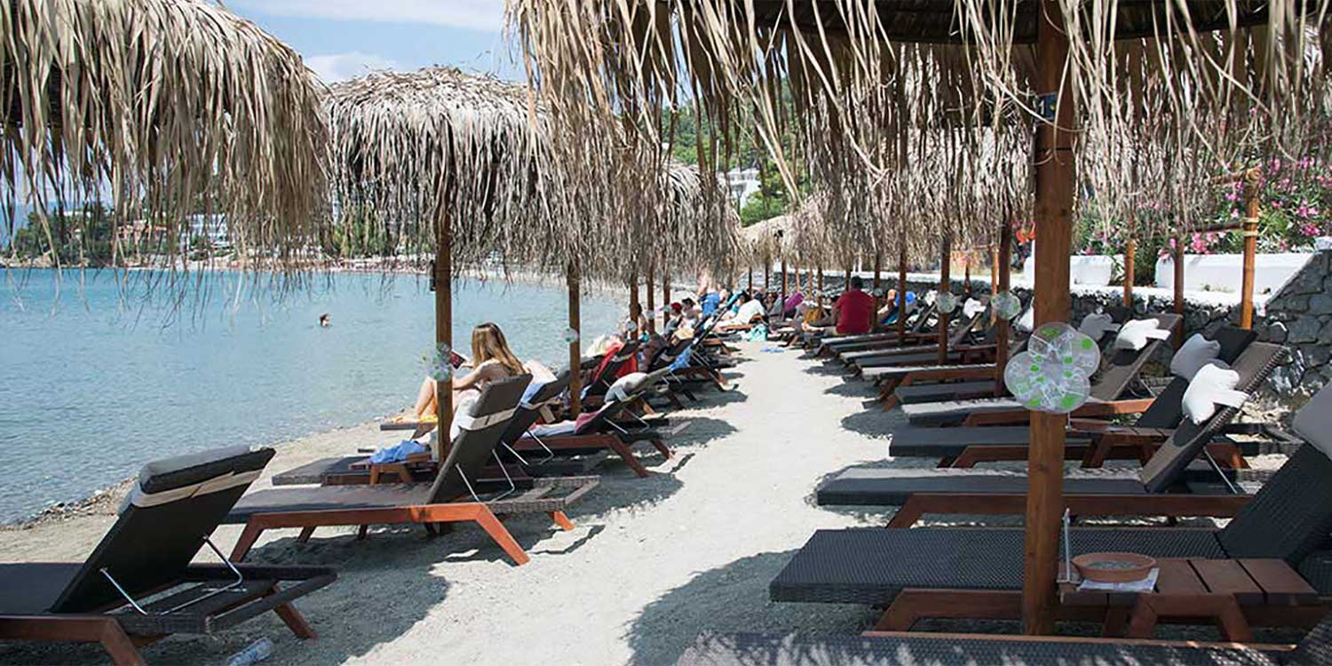 Στην αμμουδιά υπάρχουν ξαπλώστρες και ομπρέλες με τραπεζάκια, στις οποίες μπορείτε να πιείτε τον καφέ σας ή να απολαύσετε ένα όμορφο snack.